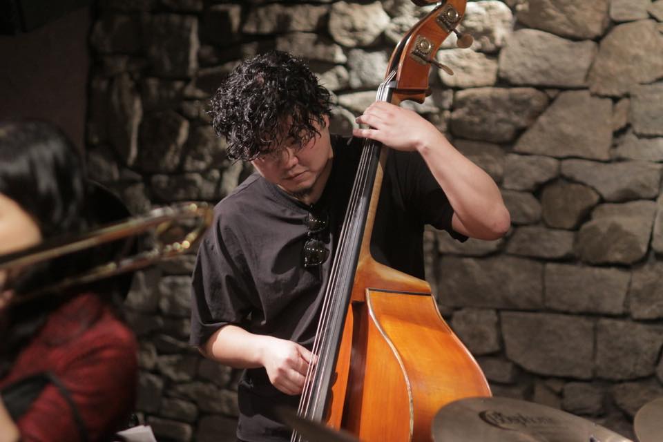 ▶平倉さんの静かで力強い一音から演奏が始まり、駒野さんの穏やかで温かい音色のトロンボーン、石川さんが高らかに吹くトランペット、平倉さんがしなやかでパワフルな音色で弾き進むピアノ…各ソロに続いて佐藤さんのエレキベースソロになりました。愛情を感じる優しい音色で、観客にというよりは、猫さんに語り掛けるように弾いていきます。独特の抑揚で残響を操り歌うようにして弾き、情感を増していきます。最後は猫さんに対する想いが溢れるような演奏になりました。アンサンブルで、しっとりと演奏し華やかに結びます。演奏が終わると、佐藤さんは大汗になっています。