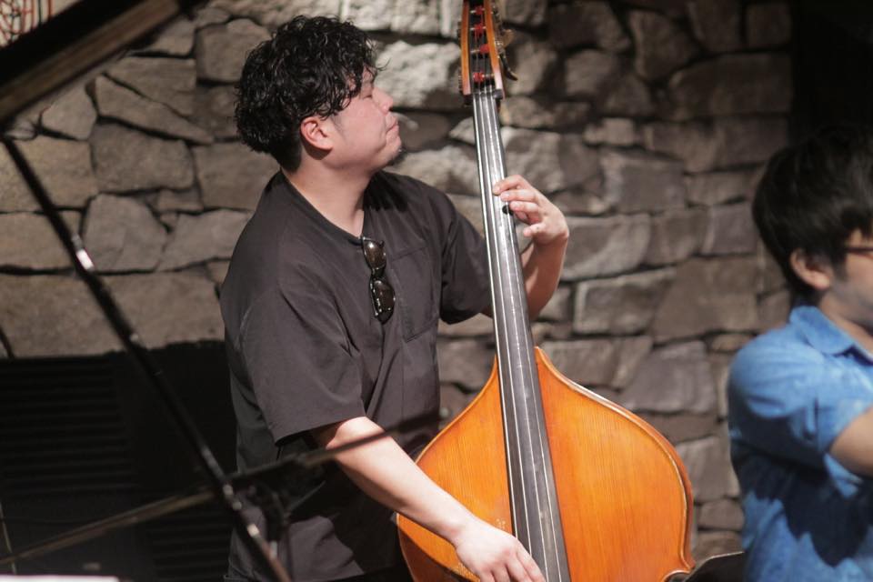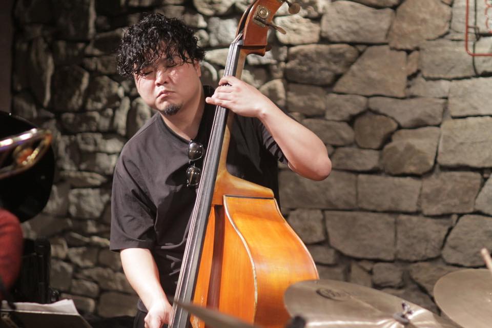 ▶残響の短い音色で歌うように弾く佐藤さんのベースソロを受け止めるように、平倉さんが優しい音色でピアノソロを弾き始めます。少しずつ強いタッチになり速度を上げ、よりシャープな打鍵で弾いていき、歌いながら演奏を進めます。さらに強度を増していき、車の運転でカーブを切るような動作で弾いて大きく歌い、遂には椅子から飛び上がるようにして躍動感豊かに弾いていきました。北沢さんが呼応して、大きなサウンドで並走します。