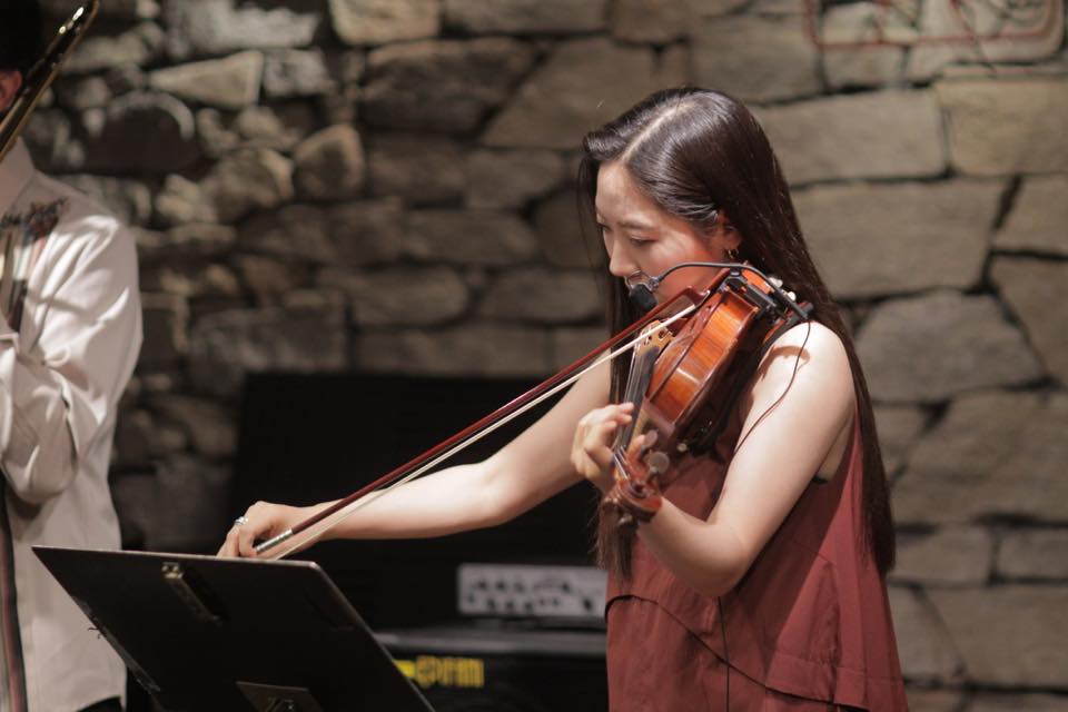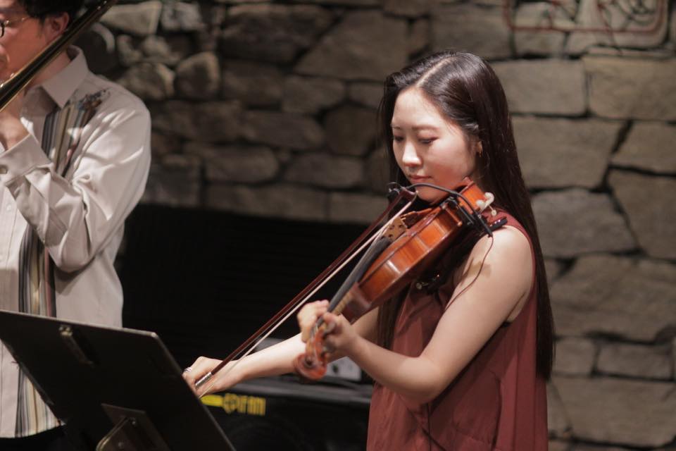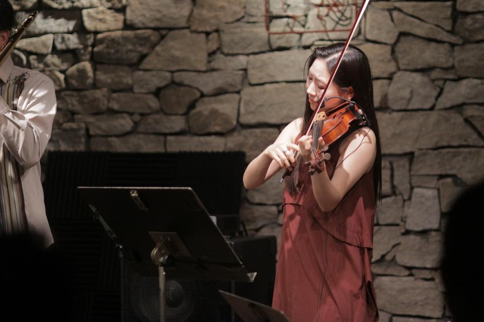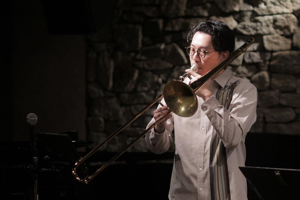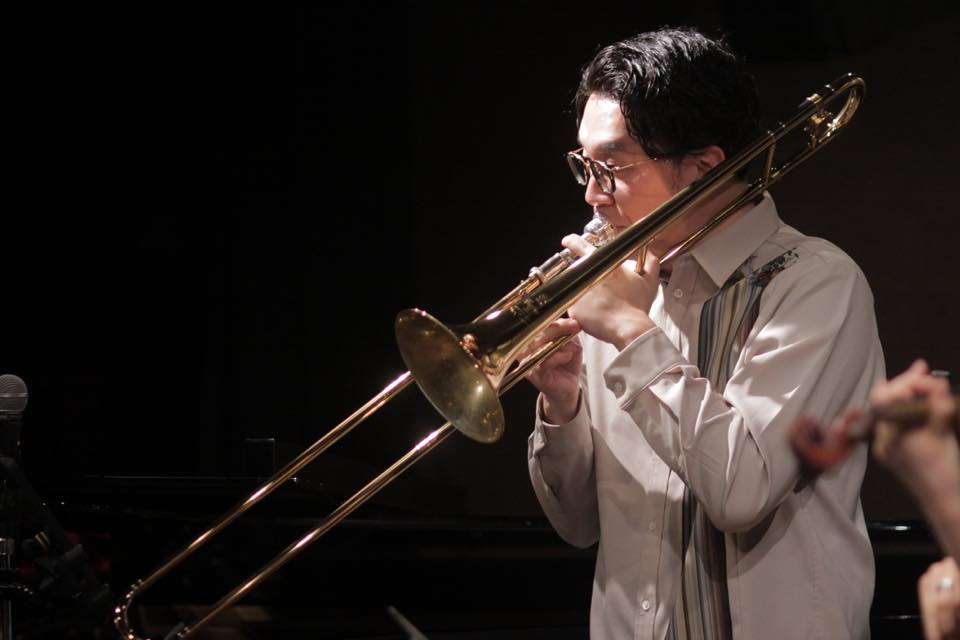 ▶アンサンブルを挟み、池本さんが温かい音色でトロンボーンを吹き、亀井さんのヴァイオリンの華麗な音色が重なり強く情感を煽ります。四人それぞれが前に出てはアンサンブルで進み、池本さんがダイナミックなトロンボーンソロを吹いて、鮮やかに ZARUKAMEの♪NEW WORLD の演奏を結びます。池本さん武本さんと亀井さん村岡さんがお互いに強く刺激し合いながら、この曲の世界観を何倍にも大きく広げていくような演奏でした。