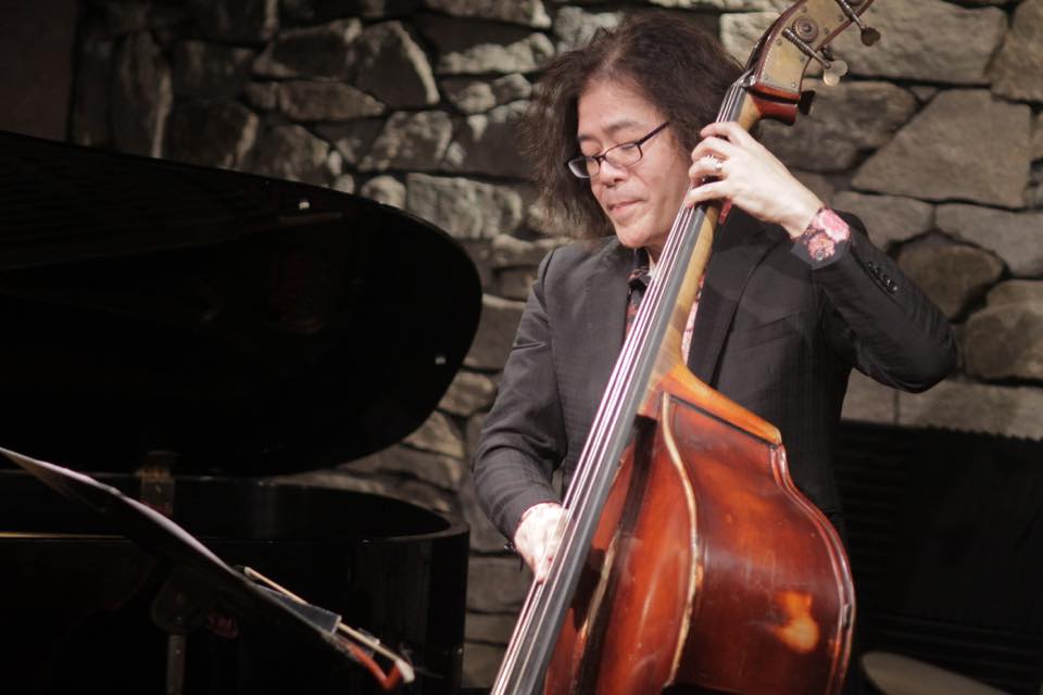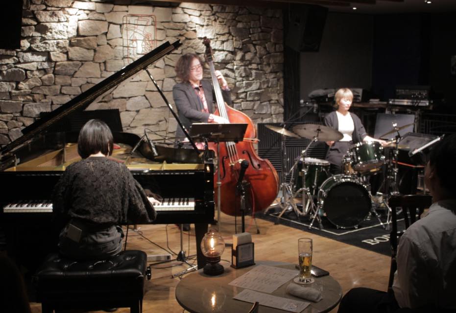 ▶1st.セットは全6曲すべてスタンダード曲を演奏。♪What Is This Thing Called Love? では高速道路を運転するように上半身を左右に倒しながら躍動感豊かにピアノを弾き、♪Just Friends では頭を軽く左右に振りつつ、微笑みながら楽しそうに弾き進み、時折右手を軽く上に上げます。鉄井さんが強いタッチで、くっきりとした一音を弾き、独特の抑揚で歌うようにベースソロを披露されました。