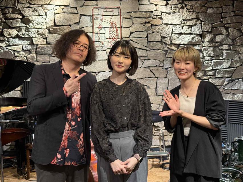 ▶週明け月曜は 智彩音(pf) 鉄井孝司(b) 利光玲奈(ds,vo) さんの《鞍智彩音リーダートリオ》彩音さんは、当店でフロアスタッフとして時々バイトしながらライブ活動などされていましたが、ずっと待機中だったアメリカ留学が決まってお店も辞めていました。最近留学も決まり、当店でのリーダーライブ初出演で昨夜はとても張り切っておられました。