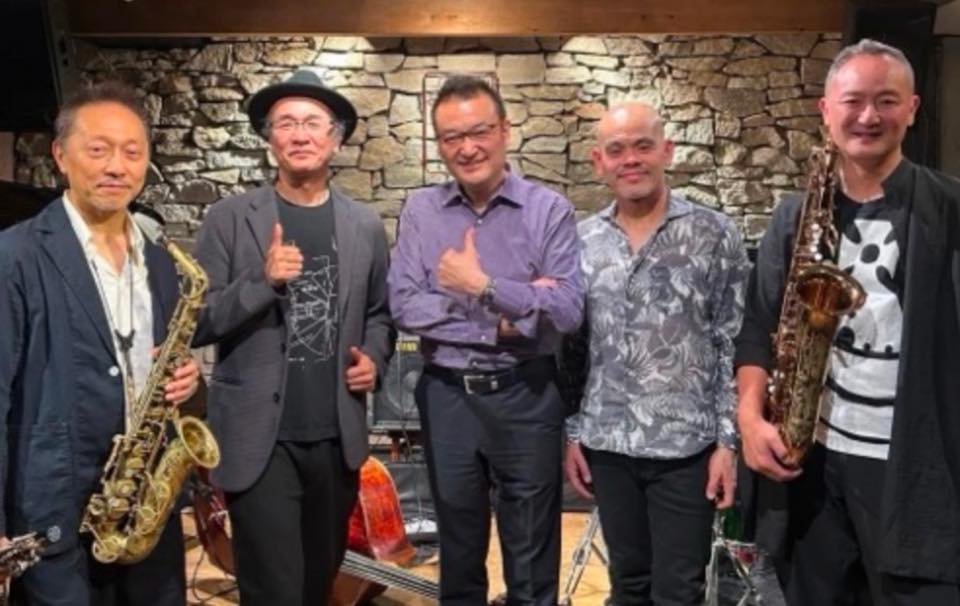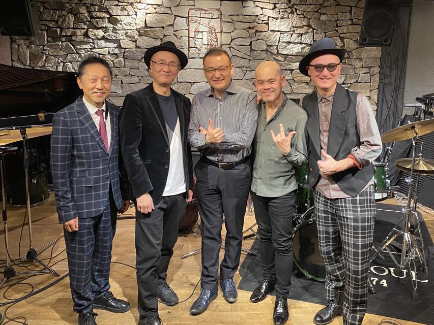 ▶このユニットはそれぞれがご自分のバンドを持っているリーダーで、日本のジャズシーンに欠かせない5人が結集した《Uniquely 5》(=比類なき5人) 近藤和彦(as) 浜崎航(ts) 椎名豊(pf) 井上陽介(b) 江藤良人(ds) さん。元々は当店の常連さんが、ご自身が聴きたくて選んだメンバーに交渉してブック、もう10年くらい当店に出演されています。