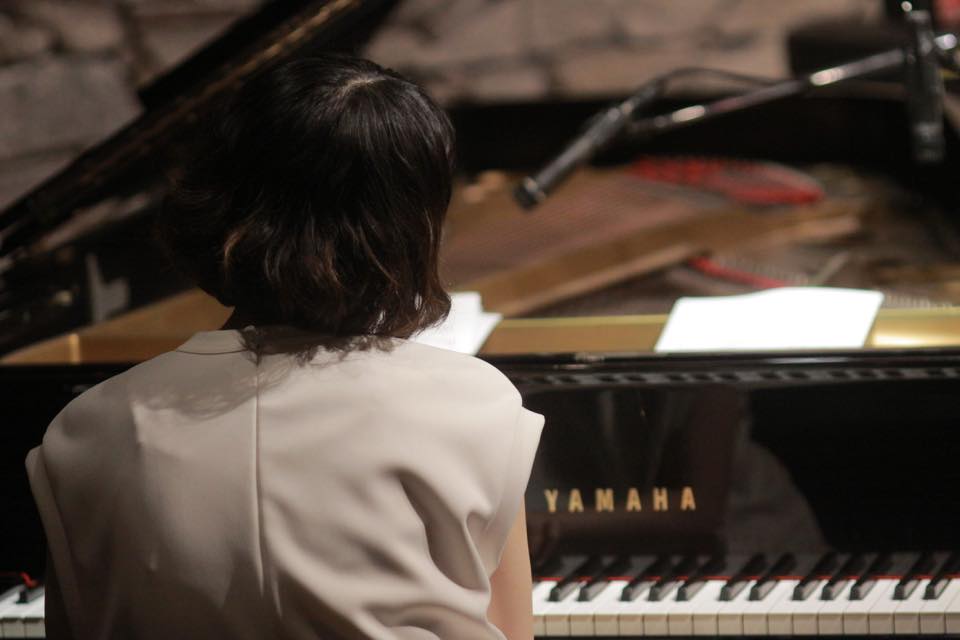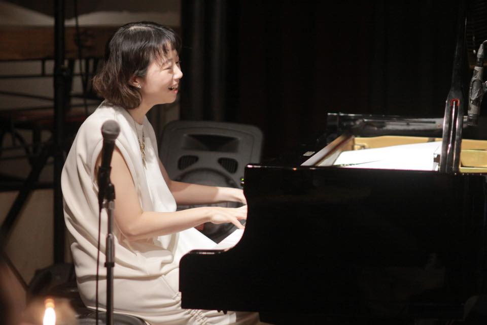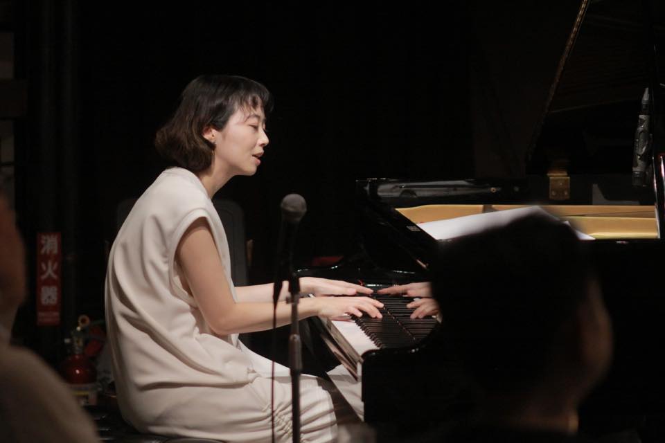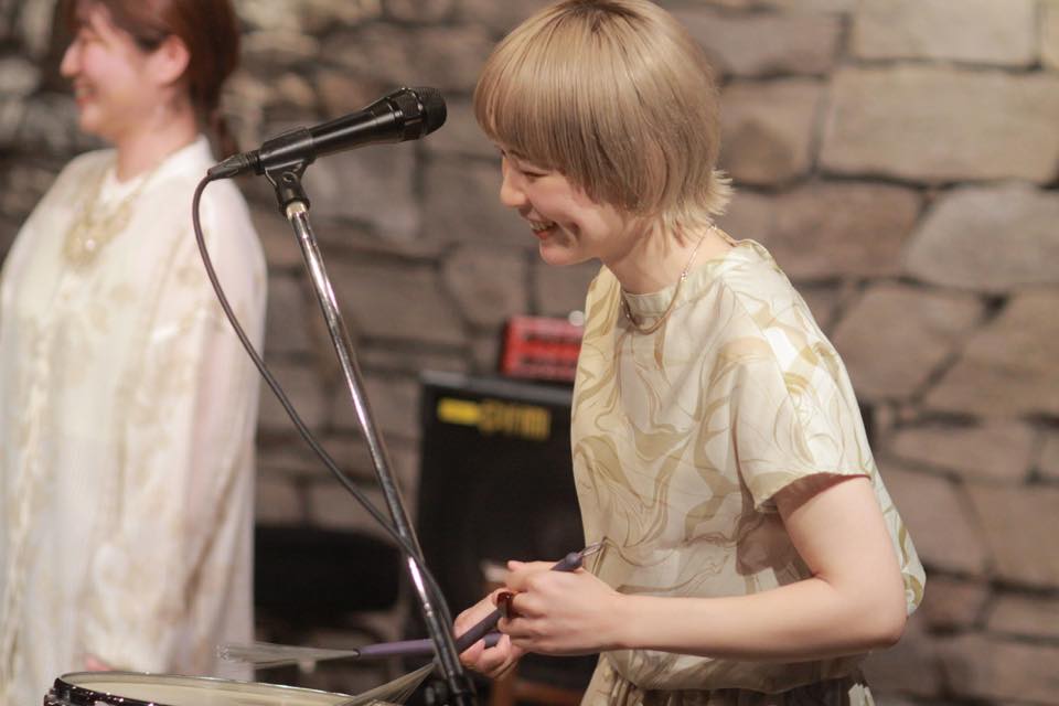 ▶須田さんが高い声を響かせるように歌っていくと、利光さんはブラシを持ちスネアの上で回し軽く叩きながら歌います。須田さんは両手を広げて歌い、鈴木さんの繊細なピアノの音色が寄り添います。ピアノソロになり、鈴木さんはピアノで大きく歌うように華やかに弾いていき、利光さんのブラシの音が並走します。鈴木さんがより力強く弾いていくと、呼応して利光さんも少し強い音で演奏が進みます。再び二人のコーラスになり、綺麗な歌声を重ね密やかな声でしっとりと♪No More の演奏を結びます。