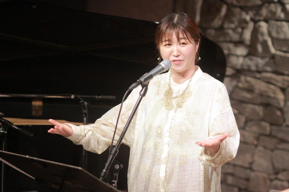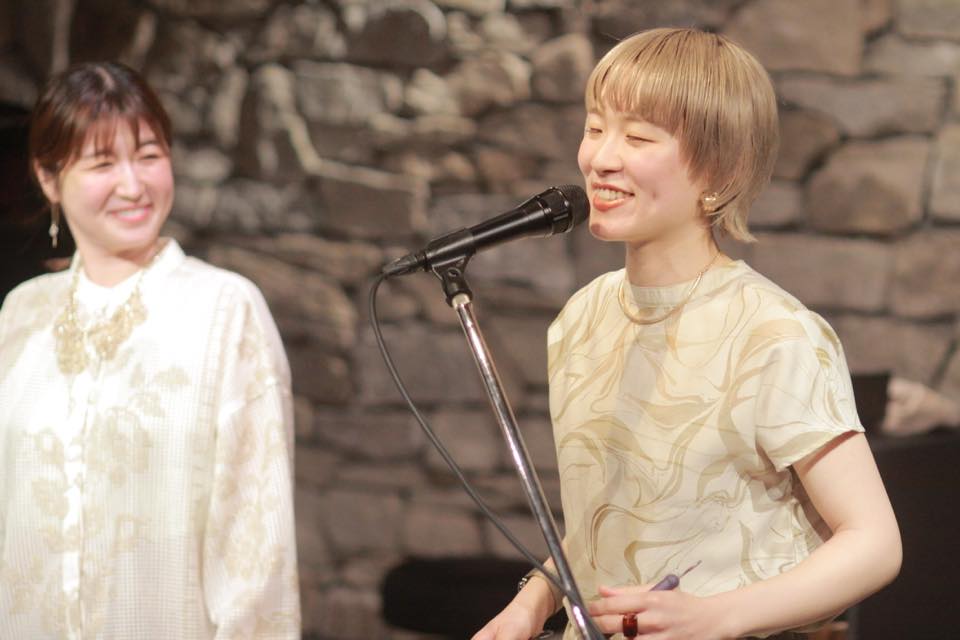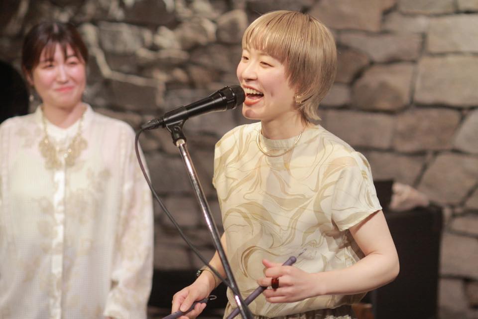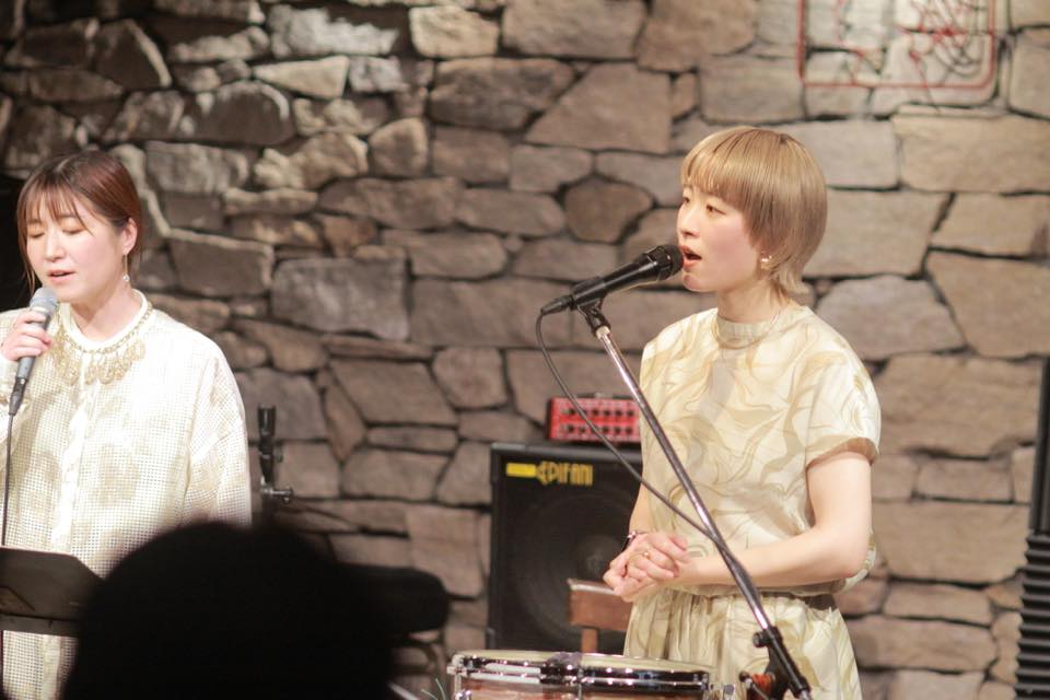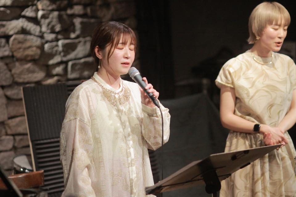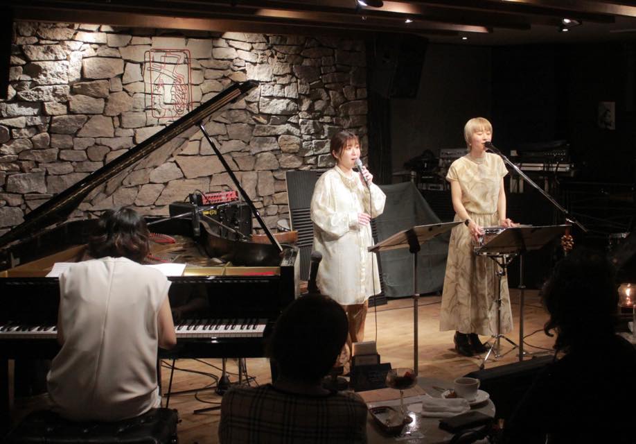 ▶京子ママの開演を告げるアナウンスで、利光さん須田さん鈴木さんがステージに登場。鈴木さんが軽やかにピアノを弾き、利光さんと須田さんが歌い始めます。利光さんはスタンドマイクの前に置いたスネアに両手を乗せて歌い、須田さんはハンドマイクで歌います。二人で美しいハーモニーを響かせ、利光さんと須田さんが交互に前に出ては、再び二人で歌声を重ねます。