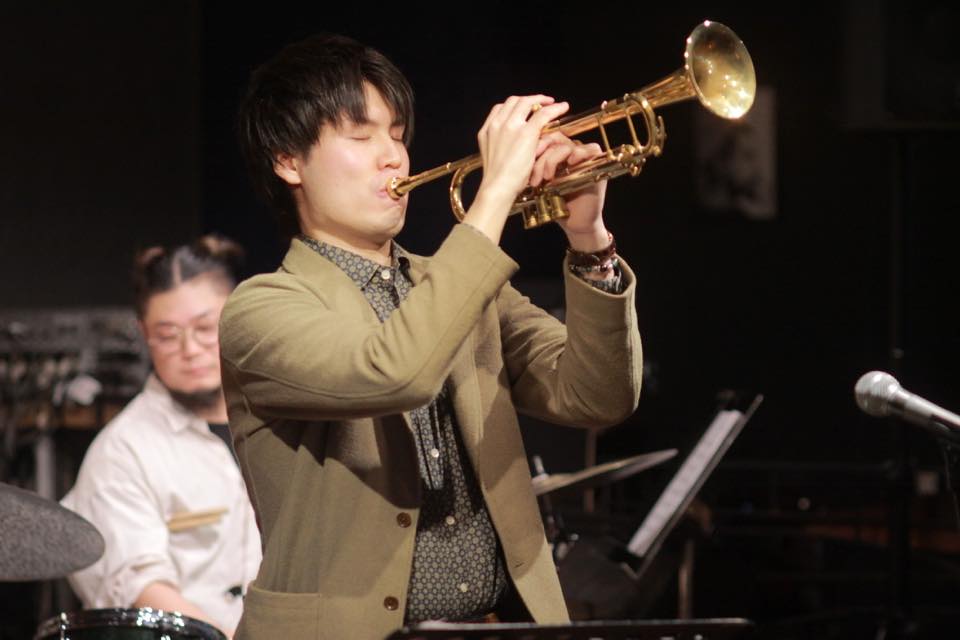 ▶鈴木さんのオリジナル曲♪NTM は、トリオが一斉に演奏を始めます。鈴木さんのトランペットが軽快に続き、ソロパートを勢いを増して吹いていきます。背を伸ばし良い姿勢で吹いていきますが、力が入ってくると左右に動き強い息で吹く力感が伝わります。小田桐さんのドラムスが、鈴木さんの背を押すように演出します。武本さんも軽やかにピアノソロを弾き、速度を上げて高速運転のようになっていきます。小田桐さんのドラムスが呼応して大きく並走します。アンサンブルになり、バンド全体で疾走し、鮮やかに結びました。
