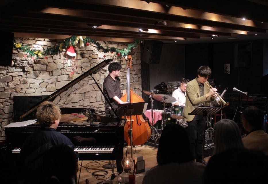 12/28(日)聴き納めデイタイムライブ《The Quartet》メンバー 武本和大(pf) 佐藤潤一(b) 小田桐和寛(ds) さんに当店初登場 鈴木雄太郎(tp) さん