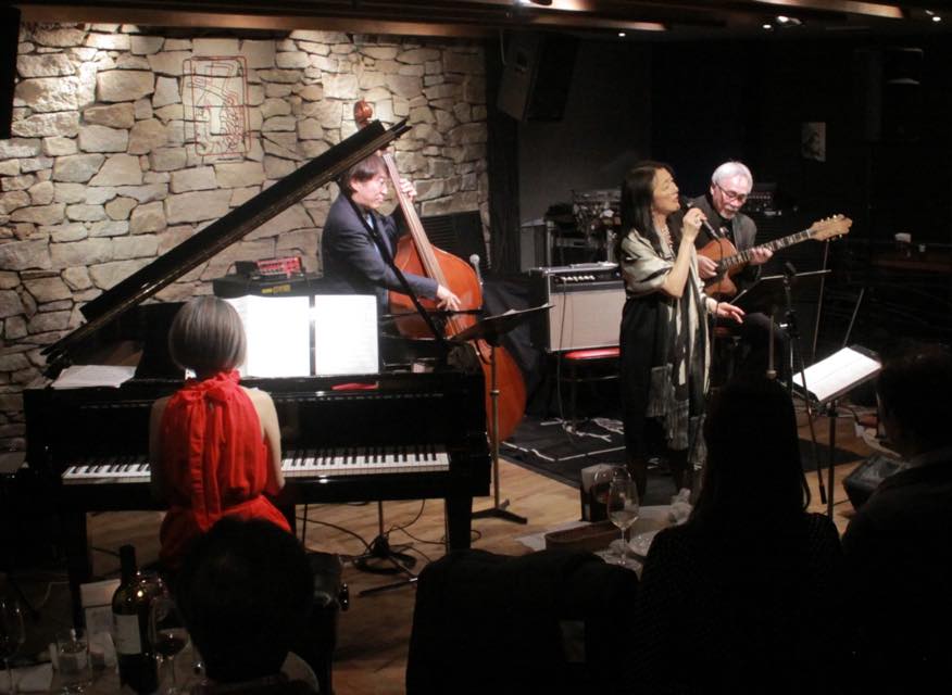 ▶週末金曜の夜は高田恵美さんのヴォーカルステージで、バッキングは 井上智(g) 中井知恵美(pf) 中村健吾(b) さんのドラムレス。恵美さん人選のこのメンバーは皆さんNYに在住して活躍されていた時のお仲間で、特にピアニストの中井さんとは向こうで一緒に苦労をした仲のようです。恵美さんのヴォーカルはやはりNYで活躍されていただけあって、しっかりしていてとても良かったです。