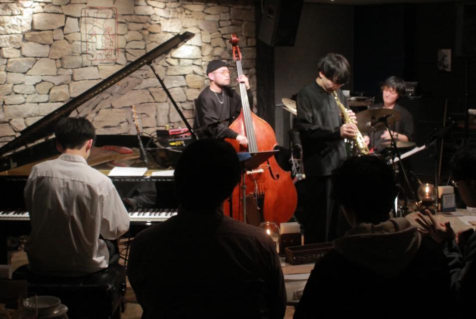 ▶50名近い観客が席を埋め静かな熱気に満ちています。20代30代の方が多く、常連客や外国人客もおられました。そんなか榎本さんが、静かで綺麗なメロディーを弾き始め、しばらくピアノだけの演奏になりました。落ち着いた音で一音一音に余韻が感じられます。波のように大きな音になっていくと、バンディさんのベース、山口さんのシンバル、そして佐藤さんのソプラノサックスが続き、一気に色彩豊かな演奏になります。