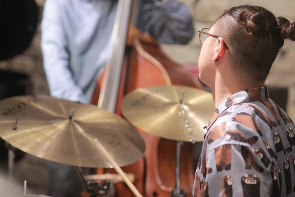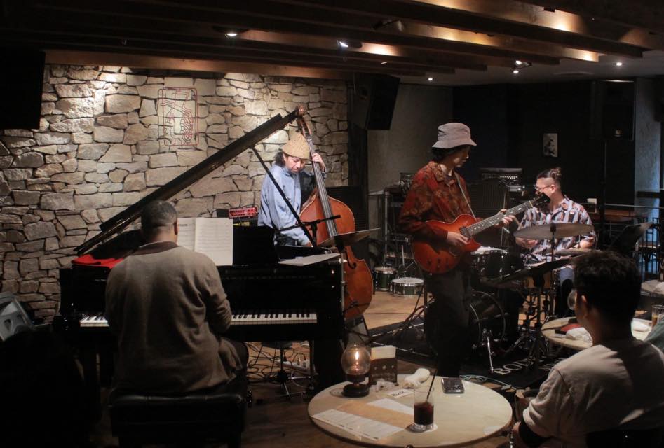 ▶メンバーがステージ登場。小田桐さんがブラシをドラムに小刻みに触れシンバルを軽く叩き、デビッドさんがピアノでミステリアスなメロディーを弾き始めます。井上さんのギターも続き中林さんはボンボンと響きの良い音でゆったりと弾いています。初めから通常とは異なる雰囲気です。