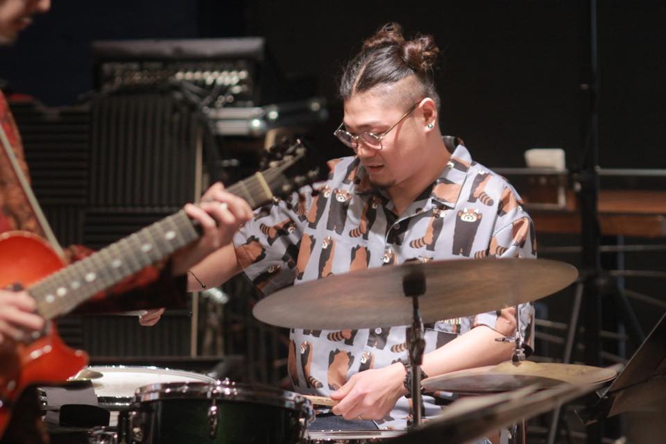 ▶一瞬音が止まり、ギターの音が前に出て井上さんのソロパートになります。すっと背を伸ばし、目を閉じてゆったりとピックを動かしてギターを弾いていきます。少しずつ音が勢いを増していくと、小田桐さんがブラシでドラム シンバルを叩く音も強くなっていきます。さらに速度を増して華やかな音で弾き進むと、小田桐さんはスティックに持ち替えシンバルを繊細に叩いて並走します。