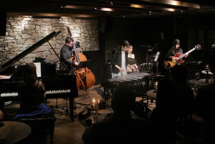4/8(水)は《THE SEXTET》浅利史花(g) 大塚義将(b) 西川彩織(ds) 山田貴子(pf) 山本玲子(vib) さん